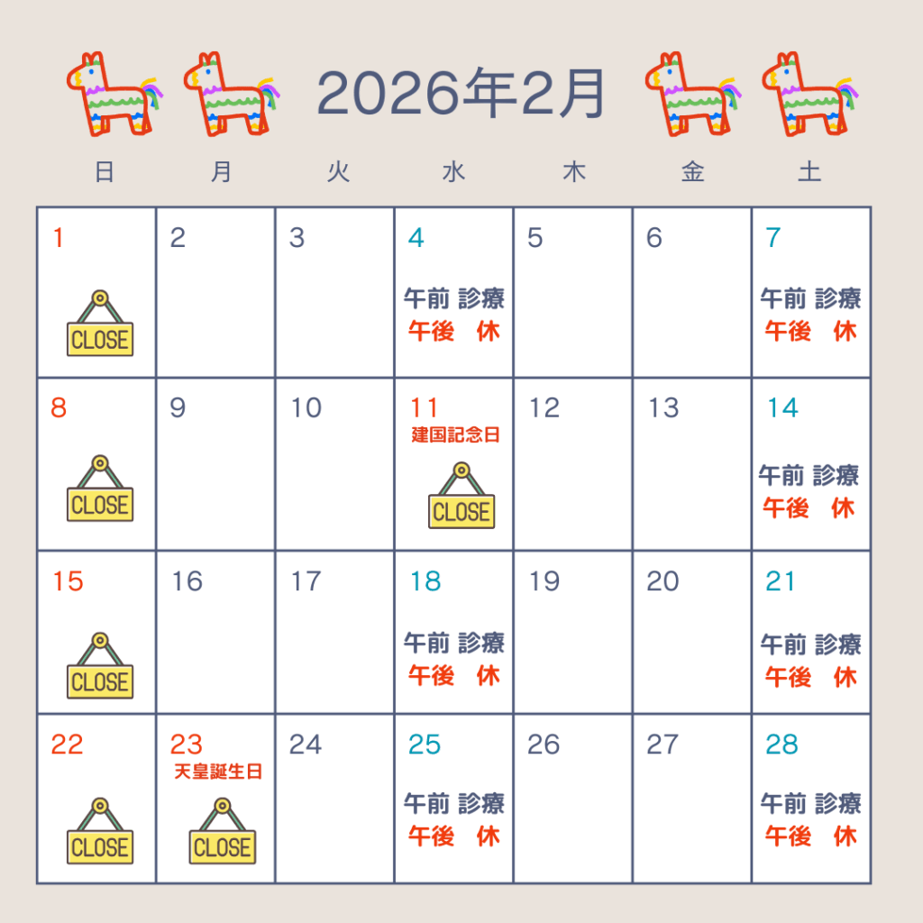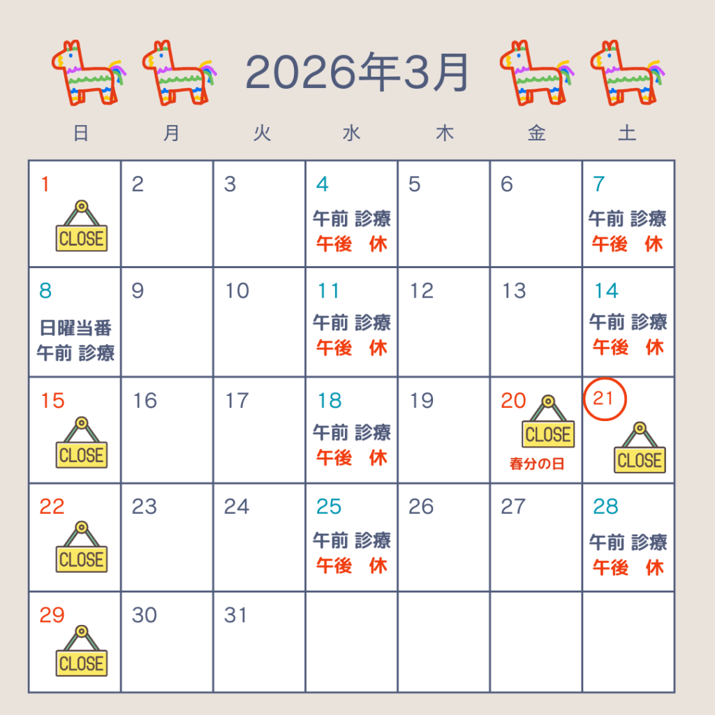 2月-3月の診療について 2026 2/09 お知らせ 2026年2月9日2月-3月の診療についてお知らせします。3月8日は日曜当番で午前診療を行います。お気軽にご相談ください。3月21日土曜日は臨時休診となります。よろしくお願いします。安藤薫 お知らせ よかったらシェアしてね! URLをコピーしました! URLをコピーしました! コメント コメントする コメントをキャンセルコメント ※名前 ※ メール ※ サイト 次回のコメントで使用するためブラウザーに自分の名前、メールアドレス、サイトを保存する。上に表示された文字を入力してください。