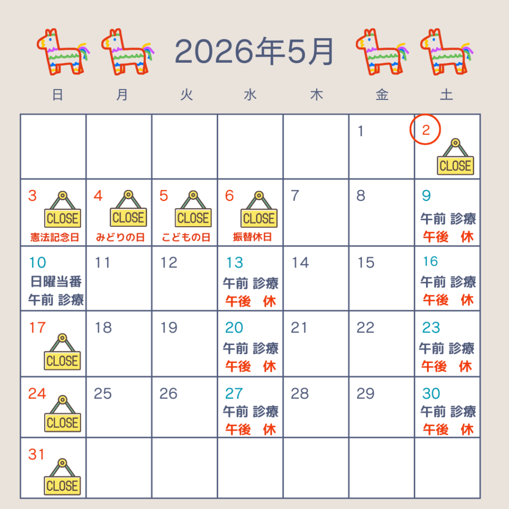 4月-5月の診療について 2026 3/31 お知らせ 2026年3月31日4月-5月の診療についてお知らせします。4月の診療はカレンダー通りです。5月はゴールデンウィークで5月2日~5月6日が休診です。5月10日は中山町の日曜当番で午前診療です。お気軽にご相談ください。安藤薫 お知らせ よかったらシェアしてね! URLをコピーしました! URLをコピーしました! コメント コメントする コメントをキャンセルコメント ※名前 ※ メール ※ サイト 次回のコメントで使用するためブラウザーに自分の名前、メールアドレス、サイトを保存する。上に表示された文字を入力してください。